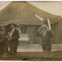 Amateur candid photo of unmarked tent with very long bally stage covered with cloth printed with st…… Become a member to read more!
