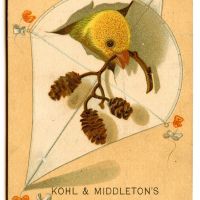 Trade Card. Beautiful, yet very odd card with color litho on front of fuzzy yellow bird holding a t…… Become a member to read more!