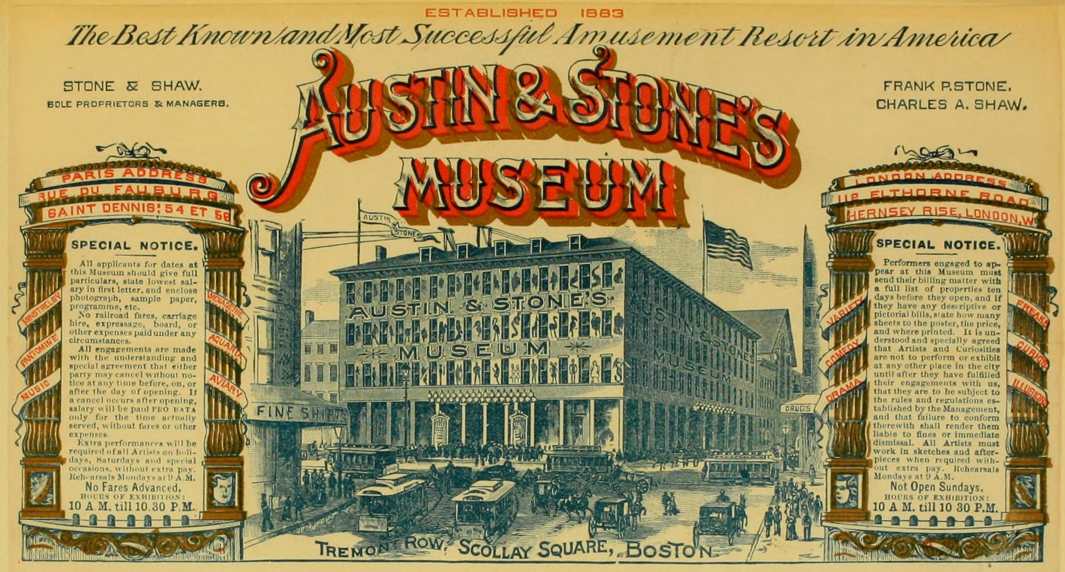 Austin and Stone’s Museum was the top dime museum in Boston from the 1870’s until it closed in about 1905. This elaborate letterhead shows the extent of their ability to promote the significant size and scope of the enterprise, including European outposts in both Paris and London.