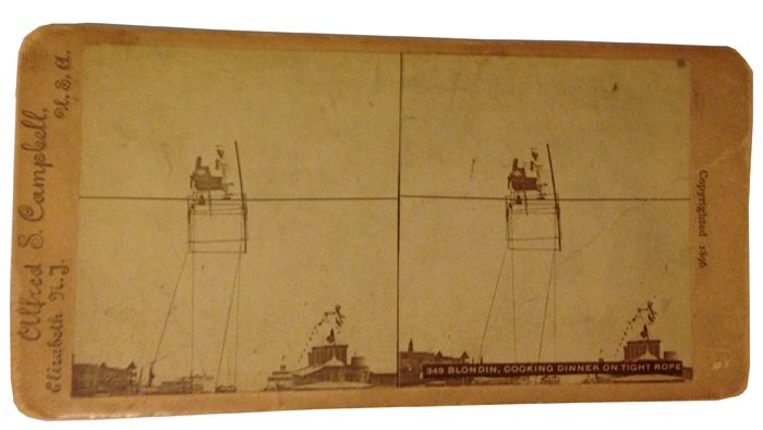 Stereoview of Charles Blondin cooking dinner on the tight rope.
