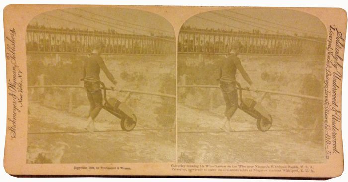 Stereoview of Clifford Calverly crossing Niagara Whirlpool Rapids with a wheel barrow.