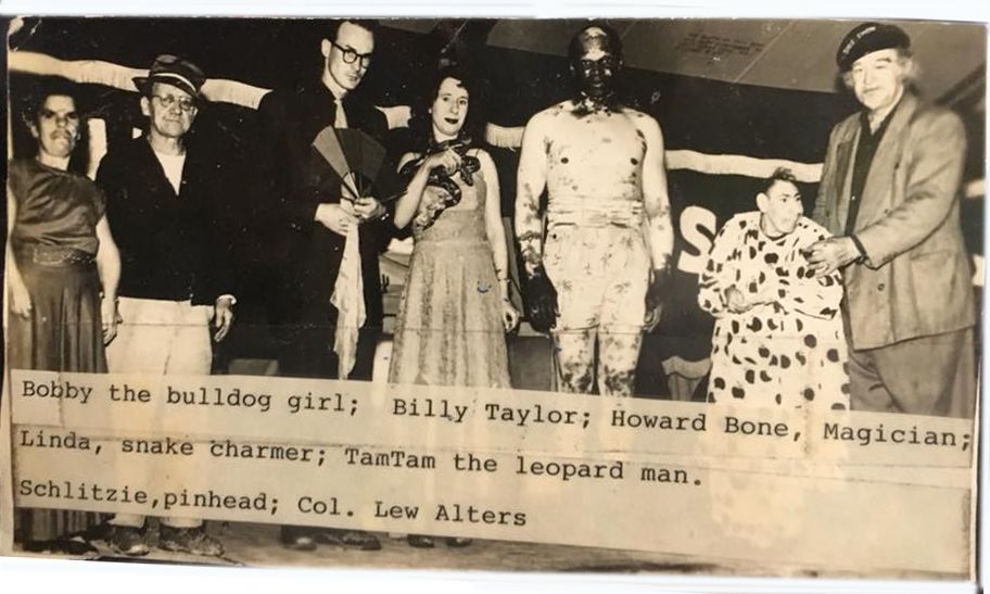 This amazing photo of a sideshow managed by Colonel Llewellyn “Lew” Alter, features some great acts: Schlitzie, Bobby “The Bulldog Girl,” Howard Bone “Magician and Escape Artist,” Tam Tam “The Leopard Man,” and a snake charmer. Llewellyn Thomas Alter (1896-1962) was a well-known sideshow operator from the 1940’s until his death in 1962.