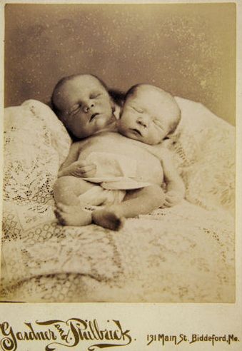 CABINET CARD. An extraordinary and rare image of a two-headed child posed clothed on a bed. This image is unusual because the subject is presented as a loved child in death, rather than as most images of the same subject are, as a medical specimen. A true gem in portrait photography. By “GARDNER & PHILBRICK, Biddeford, MA.”