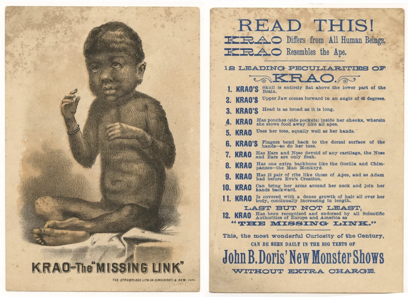 • Three versions of her color trade card while Krao was with “John B. Doris’ New Monster Shows,”