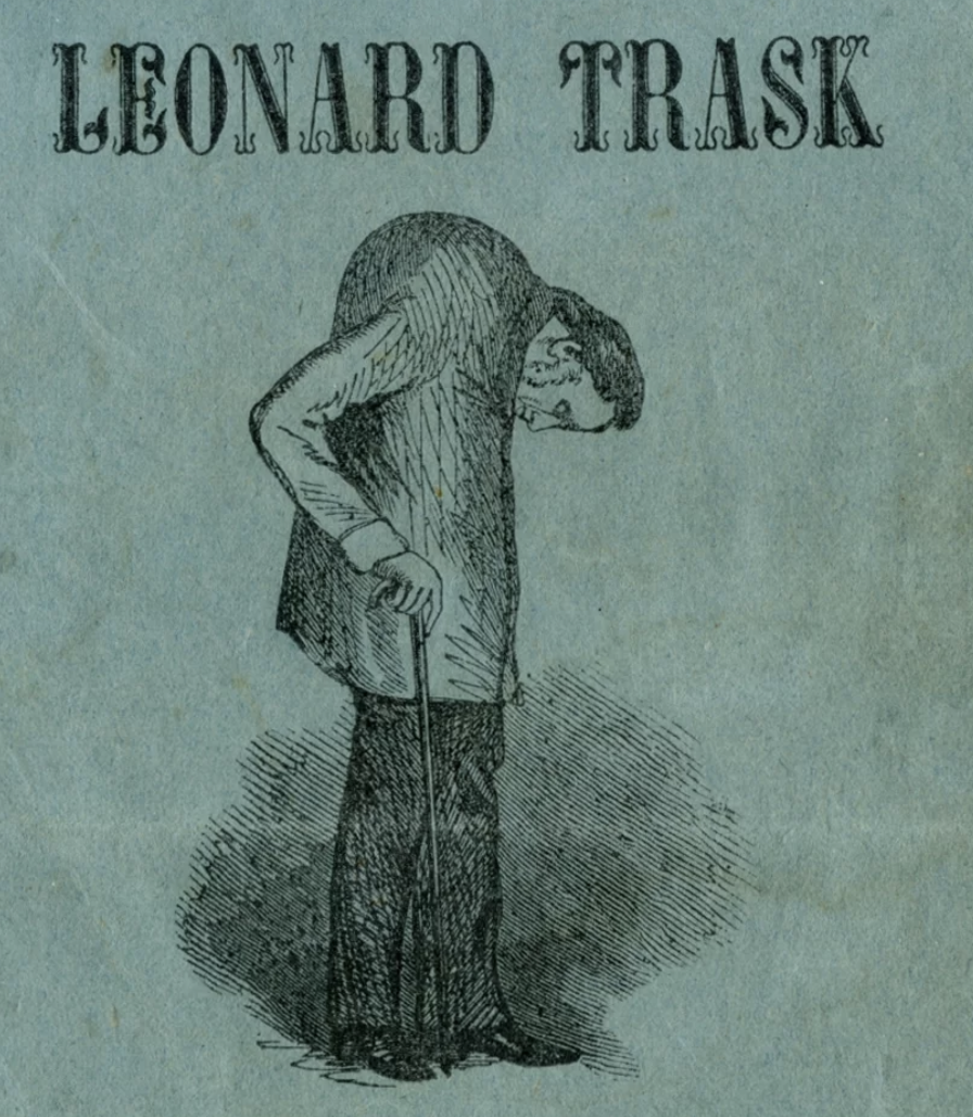 Born in Hartford, Maine on June 30, 1805, Trask acquired his odd contortion of neck and spine in 1833, when a “luckless hog” took fright, and ran beneath his horse’s hooves. Flying over his horse’s neck onto his own neck, Trask eventually crawled back to his home on a journey that took several days. Amazingly, Trask didn’t snap his spinal column, though there is some evidence that landing on his head was not a lesson for future caution.