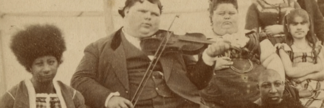 Shown in casual repose here is the greater part of the sideshow cast that year including: “Bearded Woman” Annie Jones, “Aztecs” Maximo and Bartolo, “What Is It” Zip, “Albino” Pearl Foster, and “Fat Siblings” John and Mary Powers.