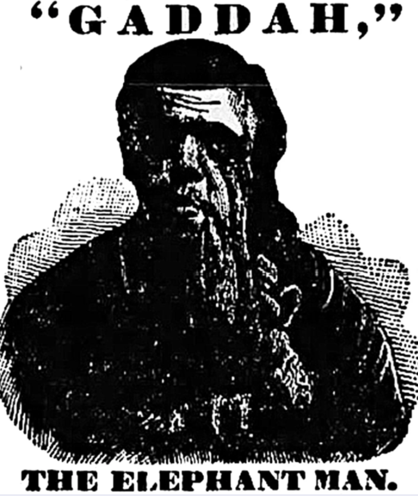 Gaddah “The American Elephant Man,” was on the dime museum stage for a mere 4-months back in 1891-1892, but his story is emblematic of the rise and fall of many virtually unknown performers with physical anomalies who graced the world of show with their countenances. Gaddah was a sufferer of neurofibromatosis, the same supposed disease of Joseph Merrick, the original “Elephant Man.” (Though Merrick has most recently been said to have had Proteus Syndrome, rather than neurofibromatosis.)