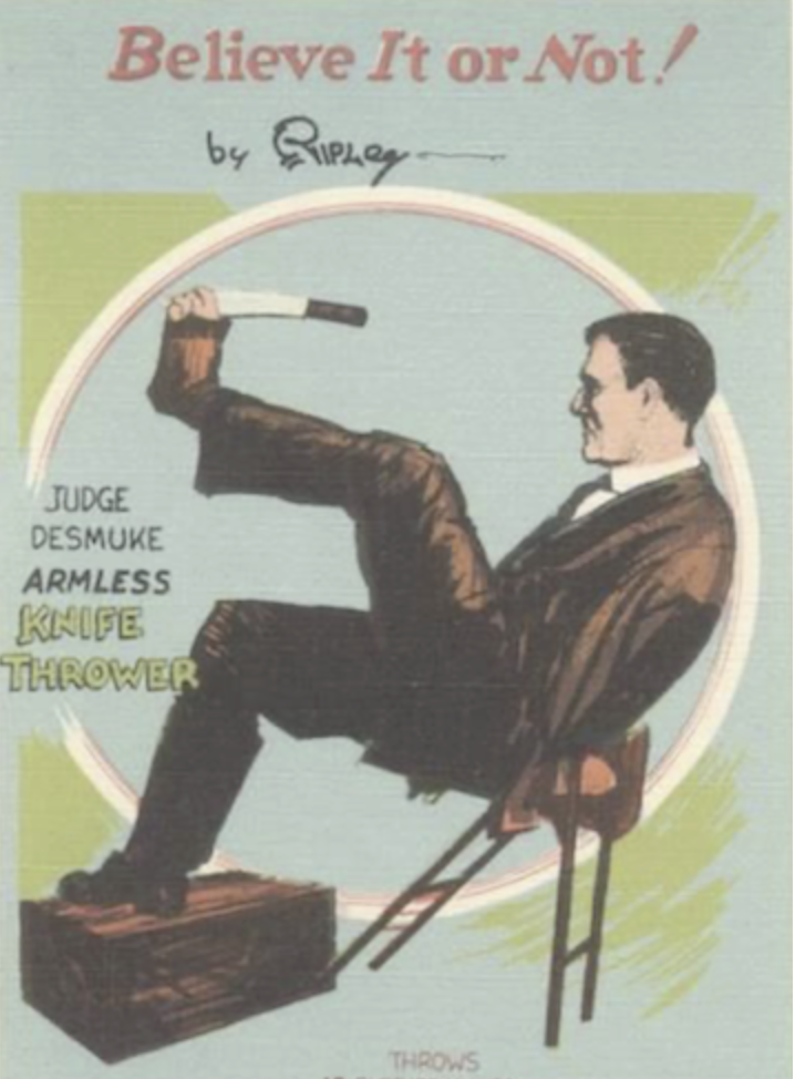 Paul Desmuke is not very well remembered today, but he was perhaps the greatest armless performer of the 1920s, 30s and 40s. Paul was a versatile and talented performer who played the violin and guitar with his feet and was also a knife-thrower.