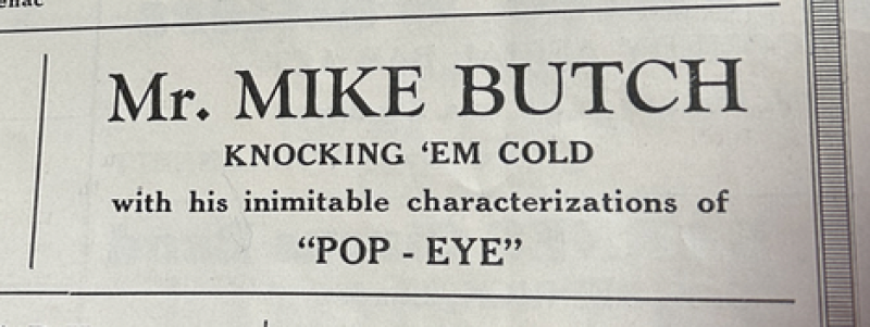 Mike Butch performed a “gurning act” and successfully imitated the E.C. Segar comic……