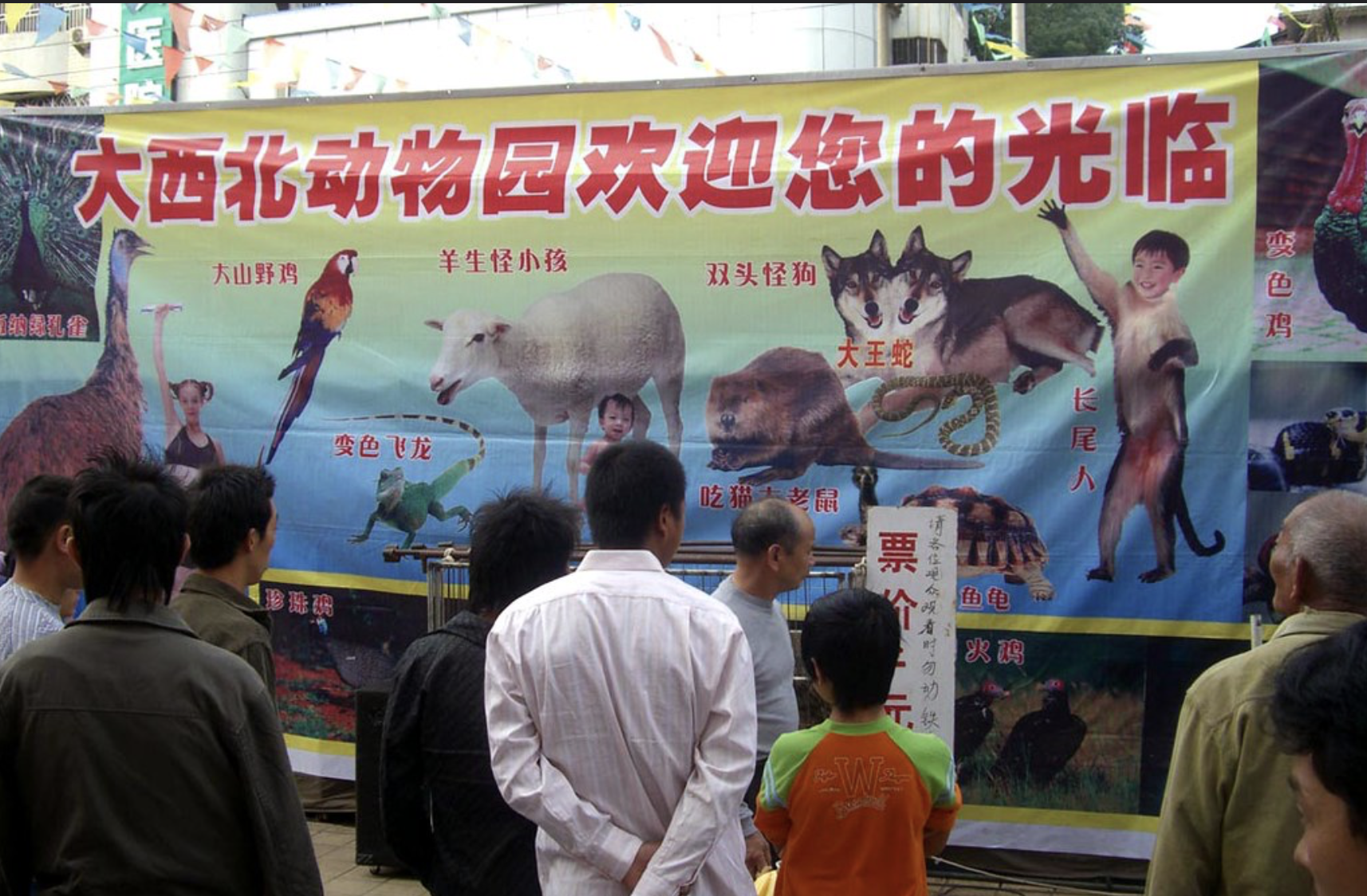 — The image to the left features a local freak animal show found in Qiuchang, Guangdong, China, ca. 2010.