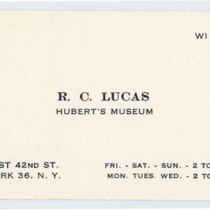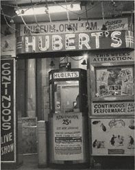 The origin of Hubert’s seems to be on Coney Island, where a 1925 advertisement for “Hubert’s Museum” in The Show World magazine lists “Hubert Miller, Owner” and shows a photo of the namesake museum on the Coney boardwalk taken by Edward Kelty. A 1927 Kelty photograph of the same location shows the sign altered to read “Huber’s Museum.” The final “t” has been dropped, perhaps signifying a change in ownership.