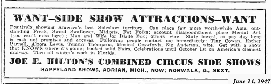 Joe E. Hilton was a sideshow owner and operator out of Kissimmee, Florida who worked mainly with Happyland Shows in the 1940s, and retired from the business in about 1960.